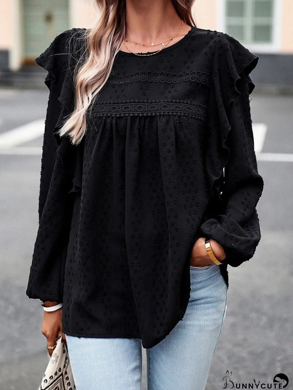 Enhance your fall wardrobe with our Black Lace Eyelet Ruffle Shoulder Long Sleeve Blouse. This elegant piece combines charm and sophistication to elevate your daily ensemble.