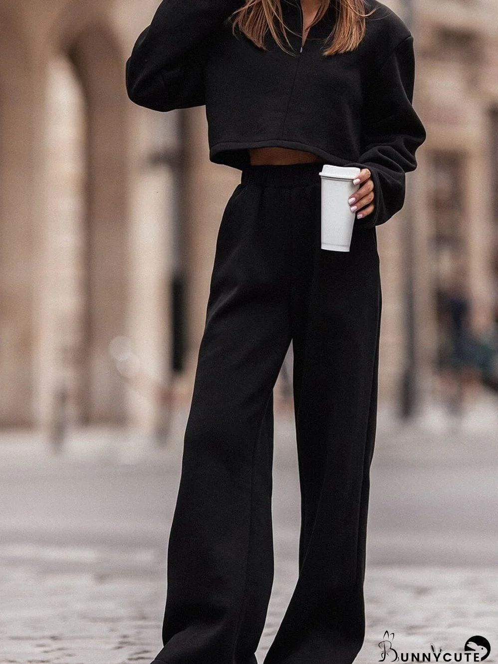 Explore the wholesale options available and elevate your wardrobe with our Black Zipped Collared Crop Top and Wide Leg Pants Set.