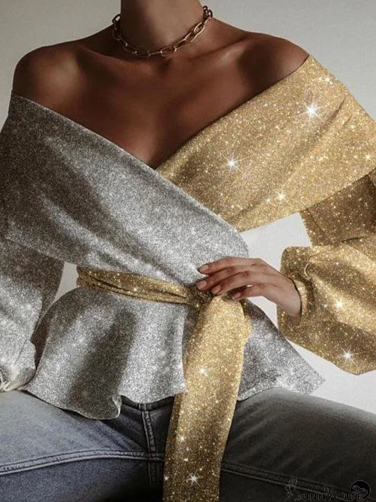 Blouses V-Neck Bronzing Stitching Belted Lantern Long Sleeve Blouse for Women