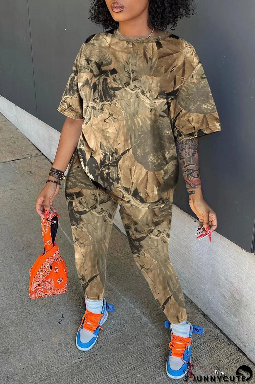 | Product Name | Yellow Brown Casual Print Patchwork O Neck Plus Size Two Pieces |