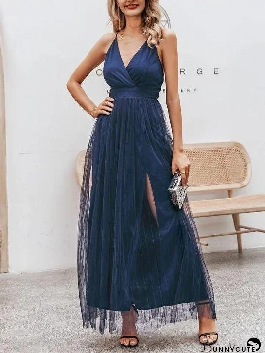 Crisscross Back Split Mesh Overlay Prom Dress for Women
