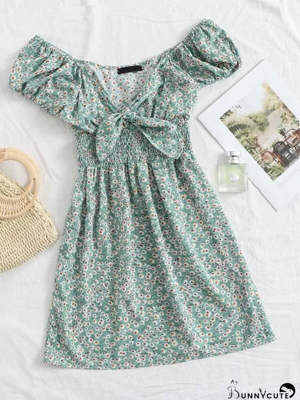 Ditsy Floral Smocked Puff Sleeves Mini Dress