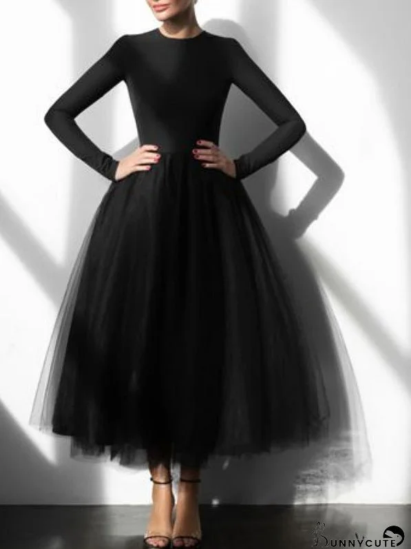 Dresses Crew Neck Mesh Panel Long Sleeve Dress for Women