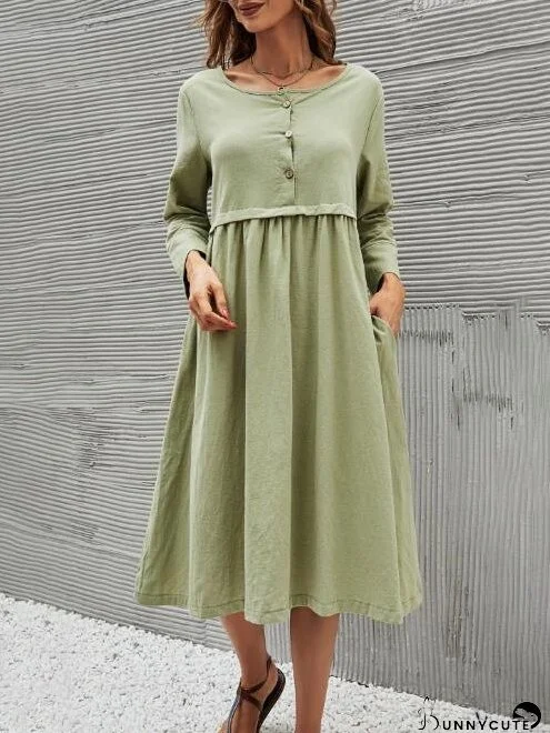 Dresses Round Neck Button Pocket Mid-Sleeve Solid Dress for Women