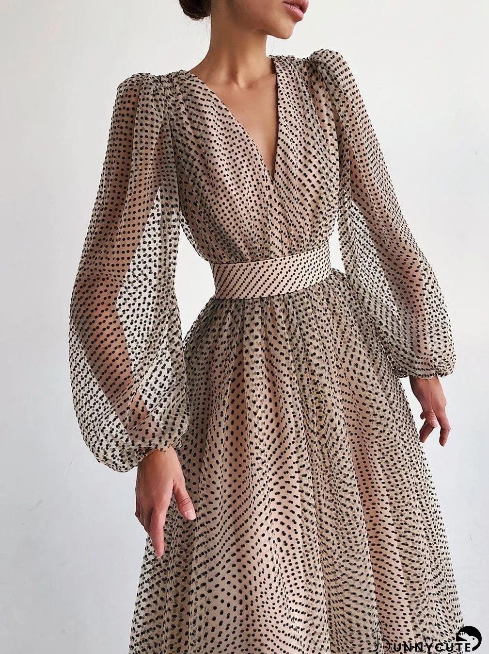 • Feature: V Neck, Polka Dot, Puff Long Sleeve