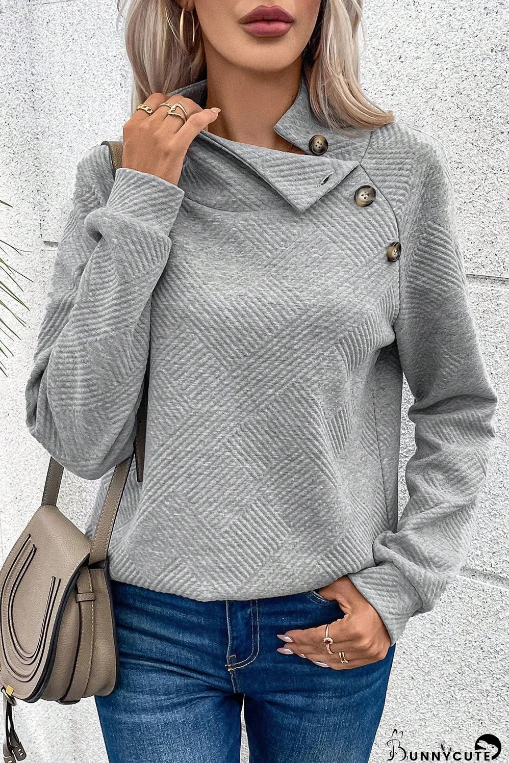 This Gray Asymmetric Buttons Detail High Neck Textured Sweatshirt is designed for comfort and style. The unique asymmetrical button design adds a trendy twist to the classic sweatshirt, while the high neck collar provides extra warmth, making it perfect for the Fall & Autumn season.