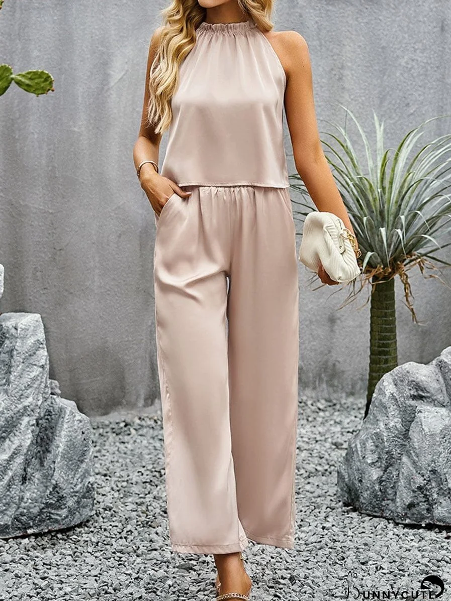 This Grecian neck sleeveless pocketed top and pants set is designed to provide the utmost comfort and style. Made from lightweight, wrinkle-resistant fabric, the top features a unique neckline and pockets for extra convenience. The matching pants feature an elasticized waist and a slim fit that flatters the curves of your body. Perfect for any occasion, this set will be sure to turn heads.