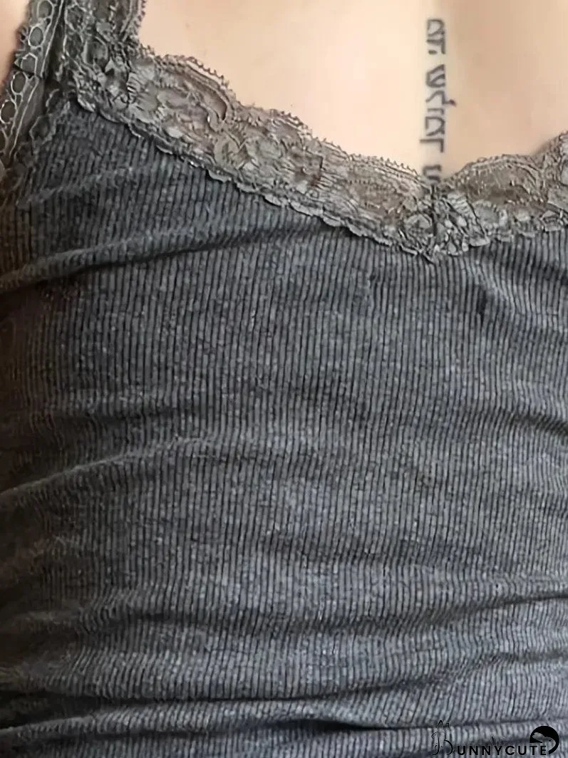 Sizzle in our Sexy Contrast Lace Deep V-Neck Sleeveless Slim Tank Top! This grey ribbed tank features delicate lace trim at the neckline for a touch of elegance. Its flattering slim fit and deep V-neck create a stunning silhouette. Perfect for layering or wearing solo, it's a wardrobe must-have. Shop now!