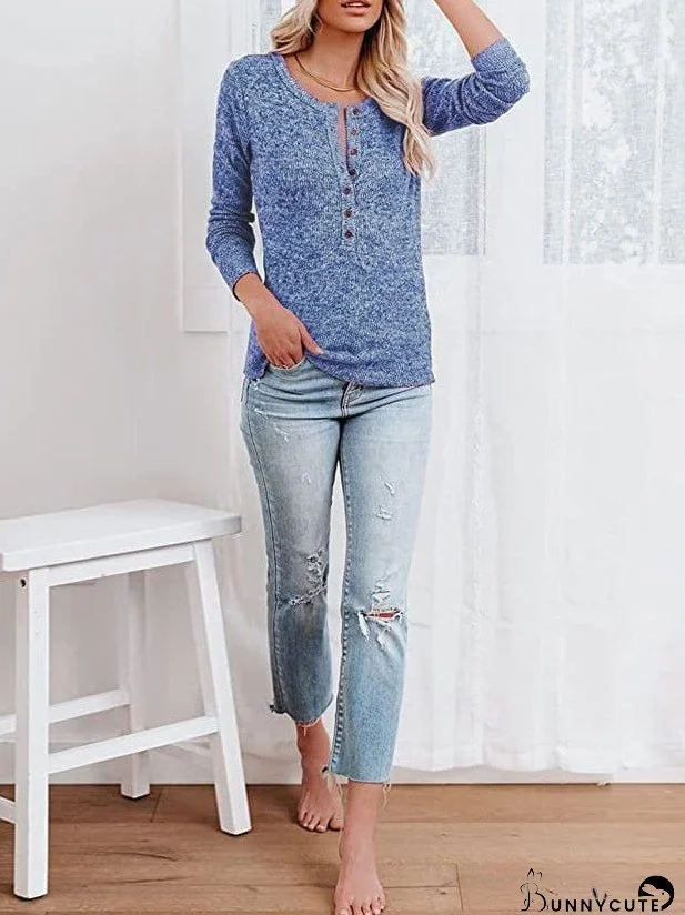 Upgrade your wardrobe with this effortlessly chic Casual Round Neck Button Long Sleeve T-Shirt. Available in versatile grey and blue, the textured knit fabric offers both comfort and style. The flattering round neck and button placket add a touch of sophistication, perfect for casual days or dressed-up evenings. Long sleeves provide warmth, while the relaxed fit ensures all-day comfort. Pair it with jeans, shorts, or skirts for endless styling options. Shop now and experience the perfect blend of fashion and comfort!