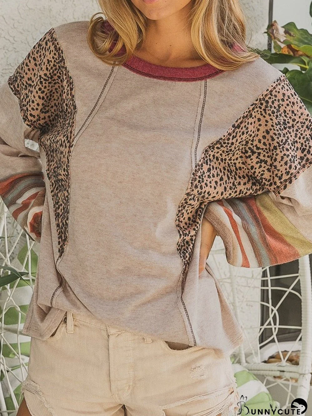 Feel casual and relaxed in this Khaki Leopard Serape Patchwork Exposed Stitching Pullover Top. This women's top is designed for daily wear during Fall & Autumn, combining comfort with style effortlessly.
