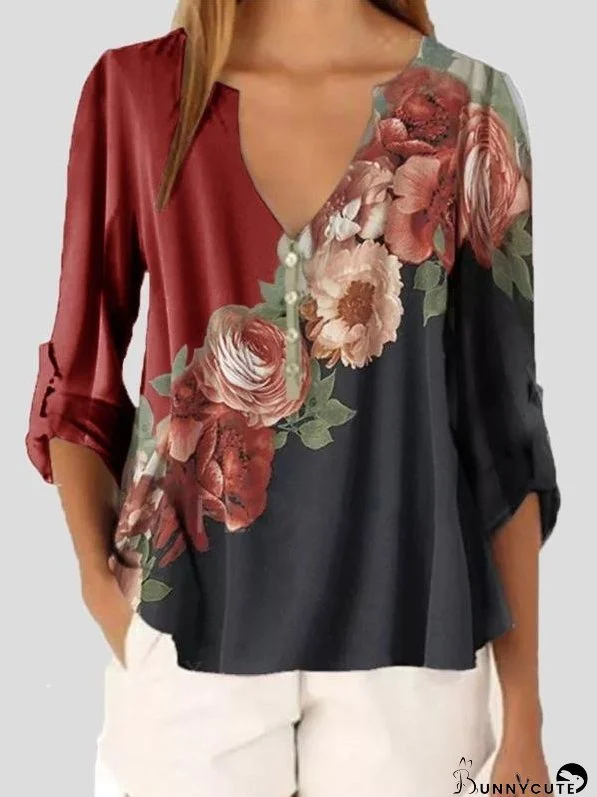 Long Sleeve V-neck Floral Print Chiffon Shirt