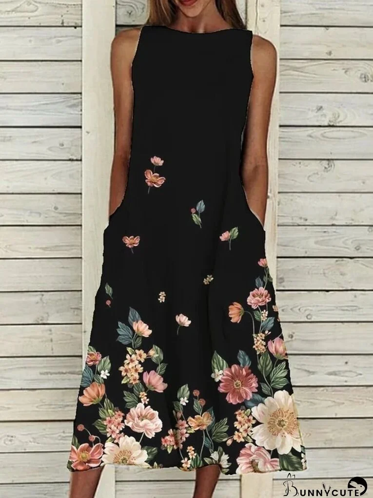 - Feature: Floral Print, Pocket, Sleeveless, Round Neck