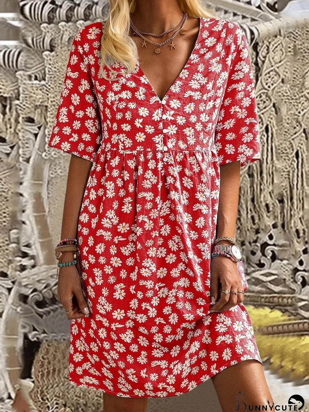 Loose V-neck Floral Print Mid Sleeve Dress for Women