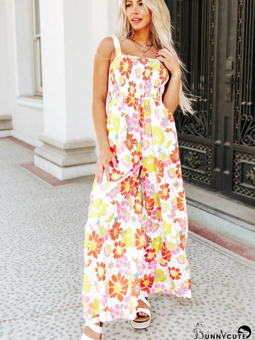 Enjoy the boho vibe and good mood from our wholesale Floral Print Shirred Sleeveless Wide Leg Jumpsuit. This jumpsuit is chic and graceful with a charming floral pattern from head to toe. The shirred bodice and wide leg design enhance a sexy and flattering silhouette. Sleeveless and sweet, this jumpsuit is perfect for ladies looking for a sexy, cool, and cute outfit. Wholesale women's jumpsuits with patterns are trendy and eye-catching.