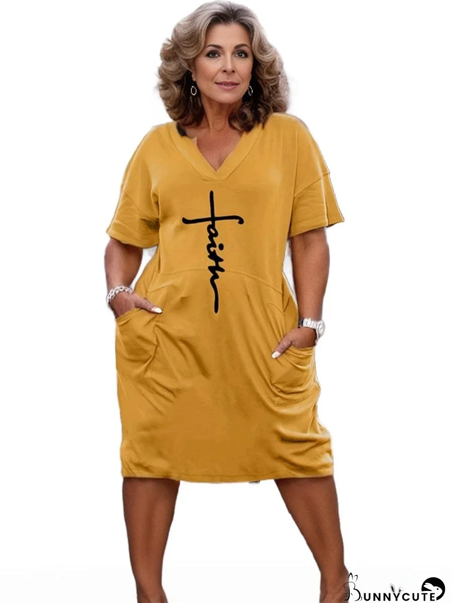 Stylish plus size midi dress featuring a 'Faith' cross graphic. Available in rust, olive, and orange. Comfortable, slightly stretchy fabric with handy pockets. Effortless style for everyday wear.