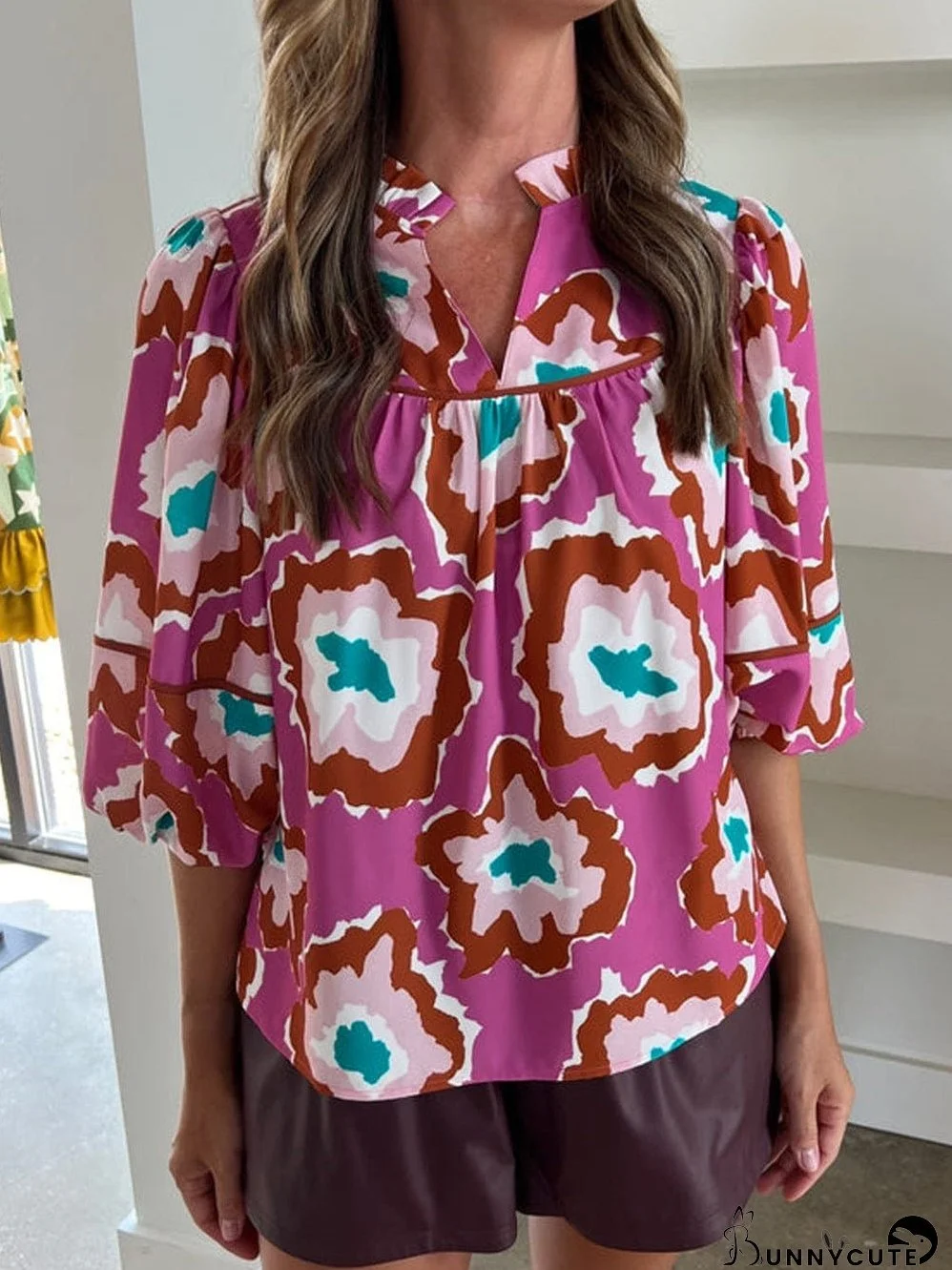 Pink Abstract Print Half Sleeve Notch V Neck Blouse