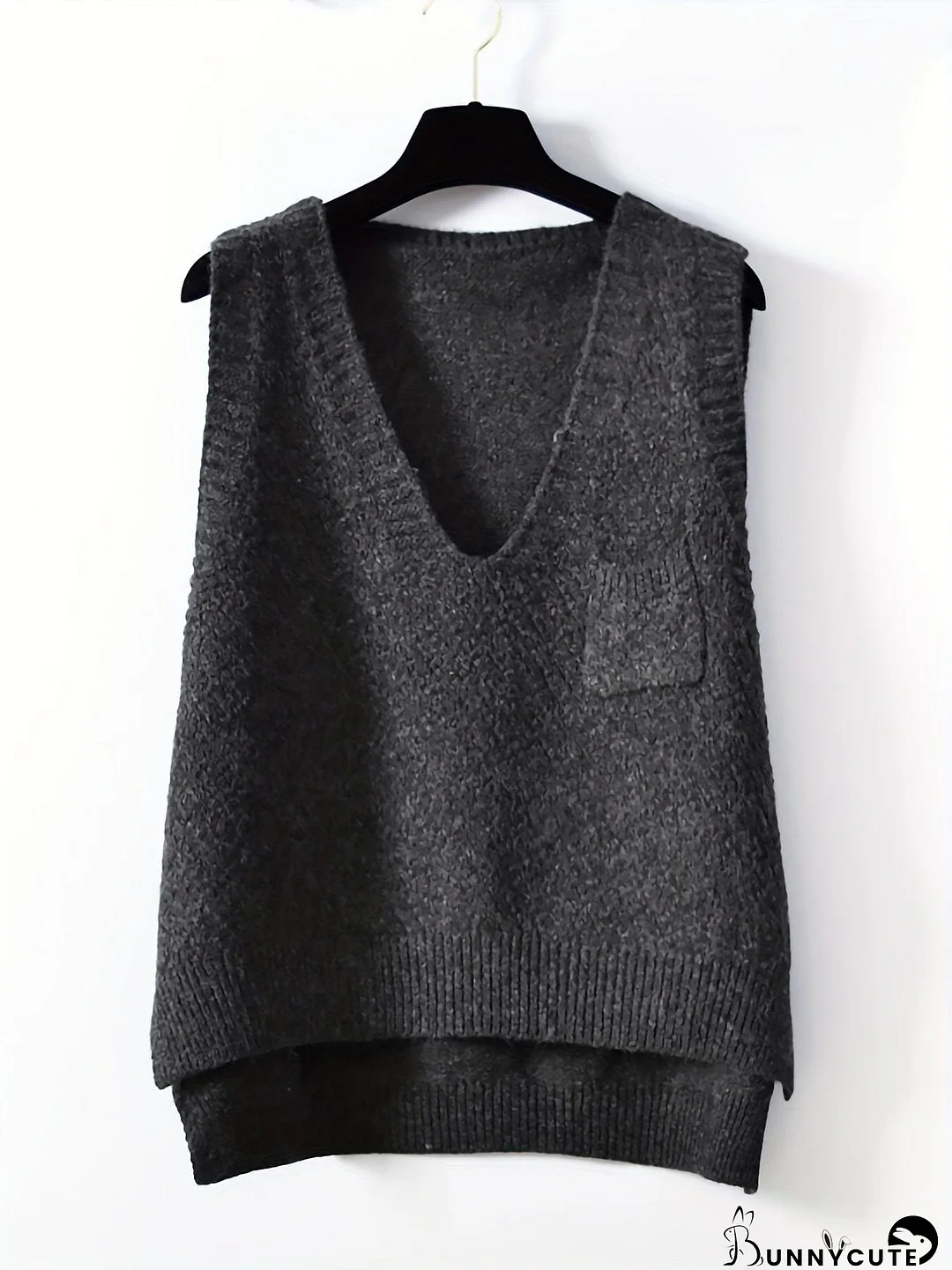 Cozy up in this stylish V-neck knit sweater vest! Its soft, brown knit fabric and flattering fit add effortless chic to any outfit. The unique textured knit and convenient front pocket complete this versatile piece, perfect for layering or wearing alone. Upgrade your wardrobe today!