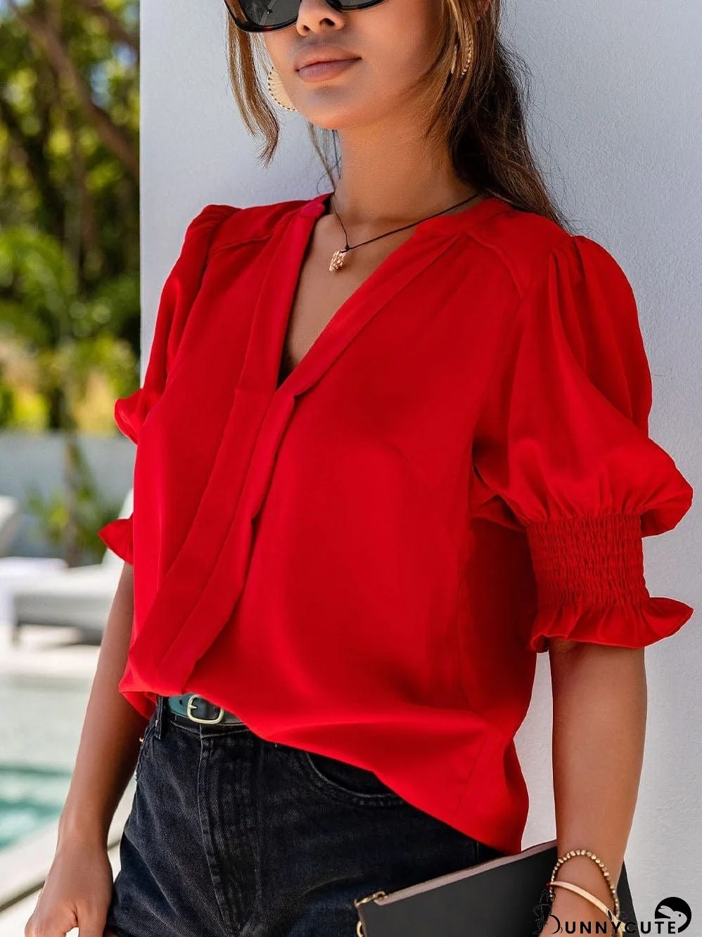 Make a statement in this vibrant crimson V-neck blouse! Featuring flattering puffy sleeves and a chic V-neckline, this blouse adds a touch of elegance and sophistication to any outfit. The comfortable, high-quality fabric drapes beautifully, creating a flattering silhouette that is perfect for any occasion. Dress it up with jeans and heels for a night out or pair it with shorts for a casual daytime look. The rich crimson color adds a pop to your wardrobe. Get yours today!