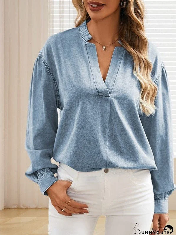 Step up your fashion game with our solid color denim top designed exclusively for women. This v-neck pullover features trendy lantern sleeves, adding a touch of sophistication to your outfit.