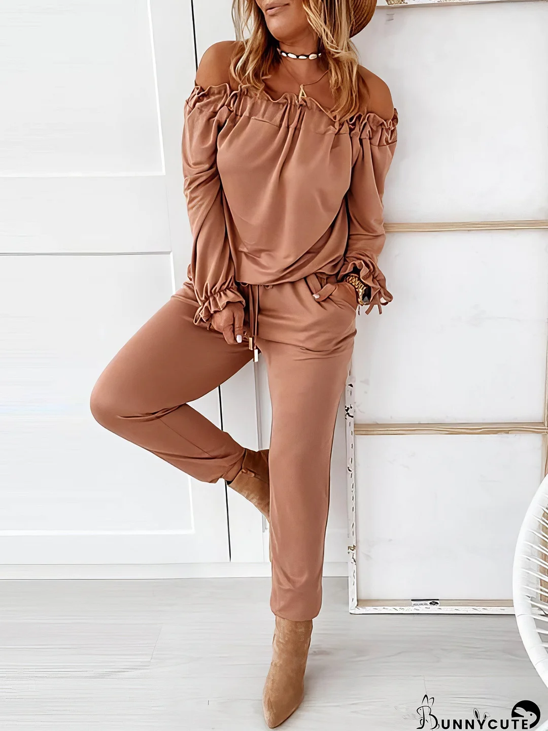 Elevate your style with this elegant off-shoulder jumpsuit! The olive green hue is perfectly complemented by the flattering, long sleeves and drawstring frill hem. It's effortlessly chic and comfortable, perfect for any occasion. Upgrade your wardrobe today!