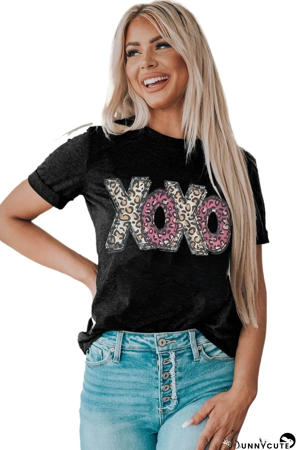 Stylish black XOXO graphic tee. Features a trendy leopard print design. Perfect for casual wear, adding a touch of fun and flair to your wardrobe. Soft and comfortable fabric. Get yours today!