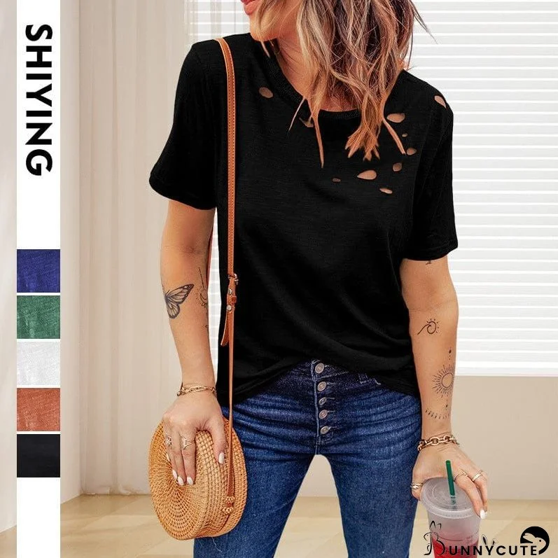 Effortlessly stylish, this ripped solid color loose fit women's t-shirt offers ultimate comfort and a touch of edgy cool. Featuring short sleeves, a round neck, and strategically placed rips, this versatile top elevates your everyday style. Available in a variety of colors to match your unique personality. Upgrade your wardrobe today!