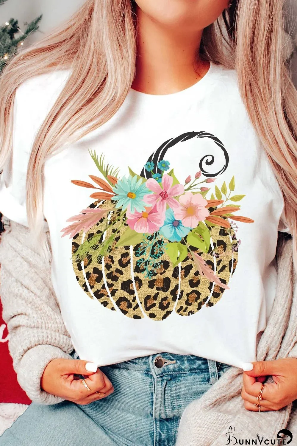 Introducing the White Floral Leopard Pumpkin Graphic Halloween T-Shirt, a must-have addition to your fall wardrobe! This unique T-shirt perfectly combines festive flair with casual chic, making it an ideal choice for Halloween festivities.