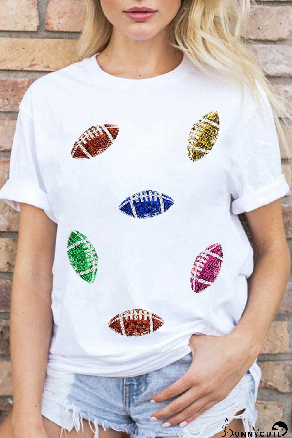 Get ready to shine on game day with our White Sequin Rugby Football Pattern Crewneck T-Shirt. This dynamic tee combines fashion and team spirit, making it an essential addition to your casual wardrobe.