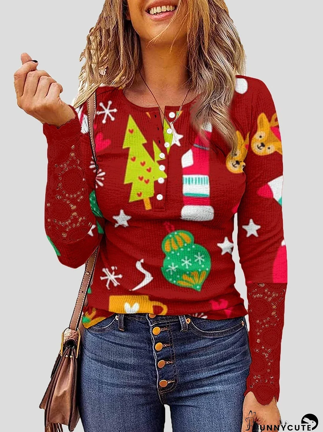 Celebrate the holidays in style with this festive Christmas print round neck T-shirt! Featuring a charming red design with Christmas trees, stockings, and other festive icons, it's perfect for holiday gatherings. The unique lace detailing on the cuffs adds a touch of elegance, while the comfortable fabric ensures you stay cozy all season long. Pair it with jeans for a casual look, or dress it up for a festive occasion. Get yours today!