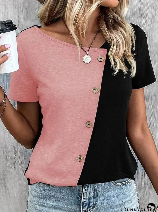 Upgrade your wardrobe with this stylish color-block T-shirt! Featuring a flattering V-neck, short sleeves, and a unique design, it's perfect for any occasion. Choose from chic color combinations that effortlessly blend style and comfort. Made from soft, breathable fabric, it's ideal for everyday wear. Elevate your casual look today!